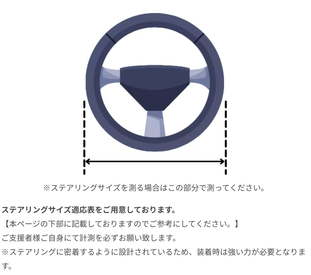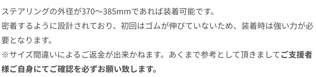 このカバーは、大型ステアリングやD型ステアリングを除くほぼすべての車種に装着可能フリーサイズ で、ステアリングの外径が370~385mmであれば装着可能です。